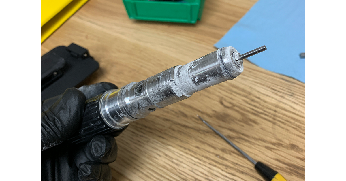 Just one example of why suction is so important can be seen with a C1-Master we recently repaired. Like all Schick micromotors the C1 has integrated sealing mechanisms to keep dust from entering the handpiece. These mechanisms are robust, but when dust collection is not being used it is inevitable that a small amount of dust will penetrate into the housing. Over time this dust will build up, and the abrasive nature will cause deterioration of the components.
